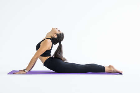 Beautiful sporty fit yogini woman practices yoga asana bhujangasana - cobra pose isolated on white background