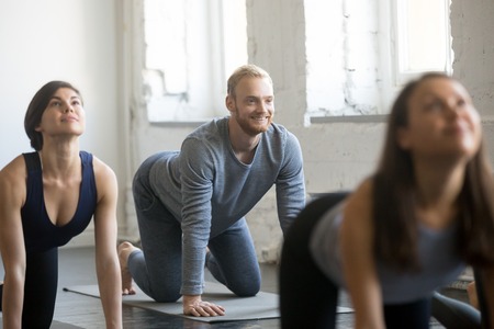 Smiling man and a group of young sporty people practicing yoga lesson, doing Cow exercise, Bitilasana pose, working out, indoor full length, students training in club, studio