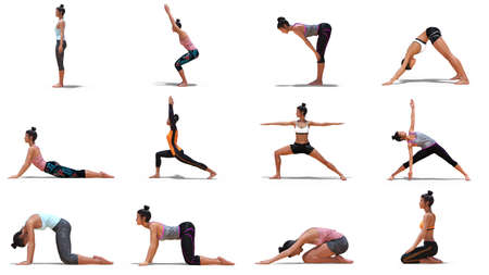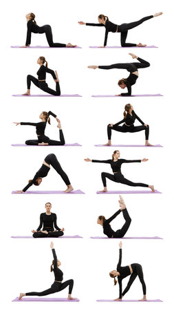 sport concept - beautiful slim woman in different yoga poses isolated on white background