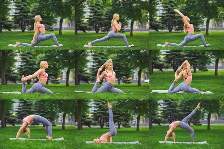 Mosaic of different fitness exercises in city park. Slim blonde woman doing various yoga asanas outdoors. Active, healthy lifestyle concept