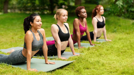 Multinational young women stretching in cobra pose at urban park, empty space. Panorama
