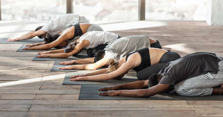 Group Of Sporty People Meditating In Childs Pose During Yoga Class In Studio, Side View, Panorama With Free Space