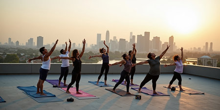 Group of people practicing yoga on the roof with cityscape background.