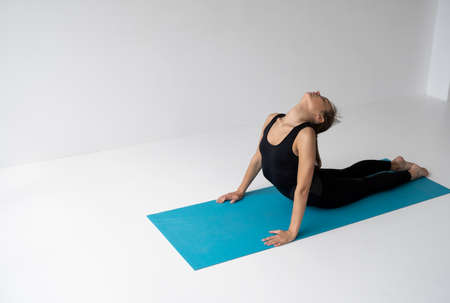 An attractive girl sits on a yoga mat. Slim body and health care. Urdhva Dhanurasana , Inverted Bow Pose or Bridge Pose