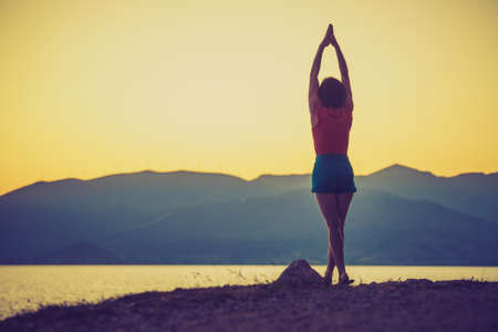 Woman practicing yoga and meditates on the mountain with ocean view at sunset. Young woman standing in vrksasana exercise, tree pose outdoor in the nature