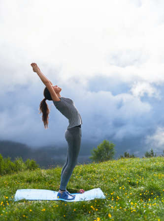 girl doing yoga exercise on the lawn in the mountains on the background of clouds