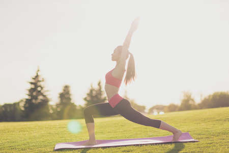 Attractive young woman in sportswear doing yoga exercise on sunny day