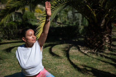 A woman practicing yoga outdoors in a beautiful park, stretching her arm towards the sky. She appears calm and focused, enjoying the sunny and peaceful environment.