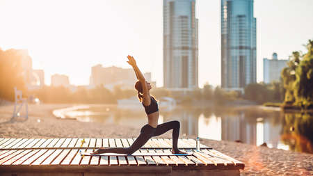 A slender, tanned Asian girl in sportswear performs yoga poses outdoors in a beautiful riverside setting in the morning. The theme is meditation on health, mental, and physical well-being.