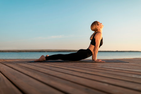 Sporty middle aged female practicing yoga outdoors, making upward facing dog pose
