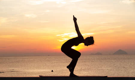Fitness and healthy lifestyle. Yoga woman silhouette on the sea during amazing sunset.