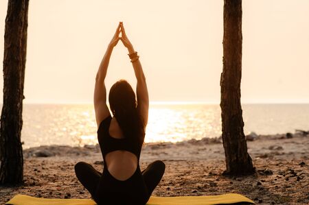 Asian young woman practicing easy yoga poses for beginners. Exercise while looking out to the sky in sunset. Meditation and Strengthening Exercises with yoga.