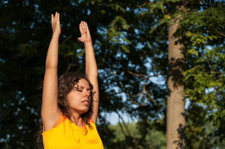 Young beautiful woman standing with eyes closed and his hands pulled up