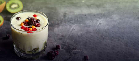 Yogurt with berry and kiwi in a glass. Fruit and berry smoothie. Milkshake with kiwi, raspberry, blueberry and banana Healthy food. Dark background.