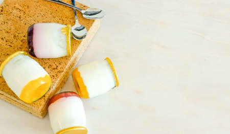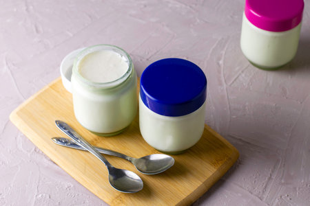 jars of homemade yogurt and spoons on a cutting board. High quality photo