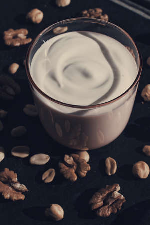dairy and rustic farm food styled concept - fresh yogurt and nuts, elegant visuals
