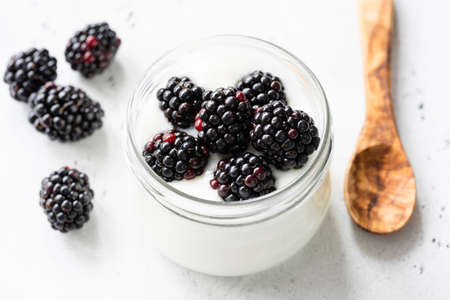 Jar of yogurt with blackberries. Healthy eating, natural food, nutrition and dieting concept