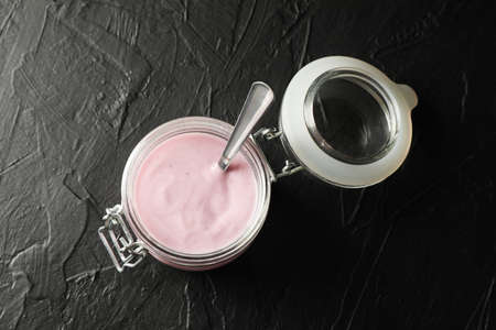 Glass jar with fruit yogurt on black cement background, space for text