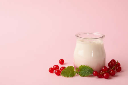 Glass jar of sour cream yogurt and cranberry on pink background