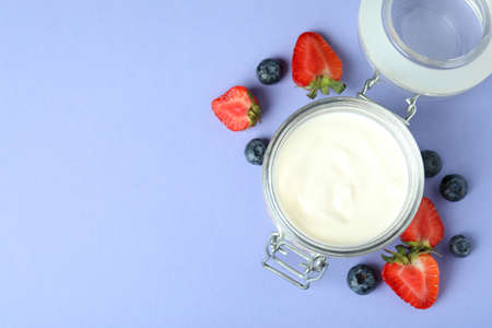 Concept of tasty breakfast with yogurt on violet background