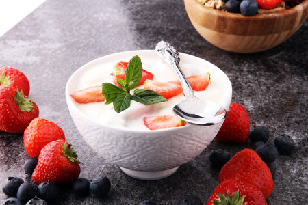 Greek yogurt with blueberries and strawberries, close up