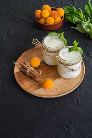 fresh tasty yogurt and fruits peaches and apricots on wooden background. Healthy Breakfast Concept. close-up