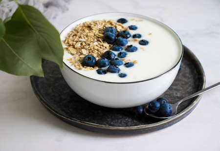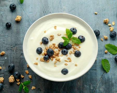 Greek yogurt with granola and blueberries in white bowl. Healthy breakfast food or snack.