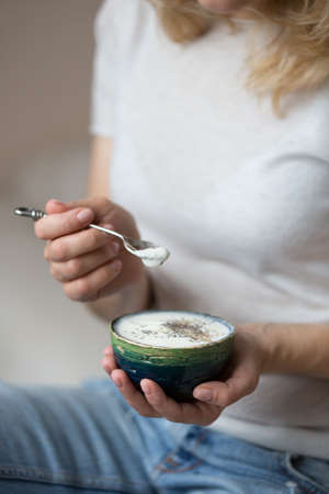 Closeup of woman's hands holding cup with organic yogurt with blueberries, coconut and fresh mint. Homemade vanilla yogurt in girl's hands. Breakfast, snack. Healthy eating and lifestyle concept