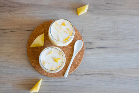 Delicious milk dessert with pieces of melon in glass glasses on a wooden table, top view, flat lay