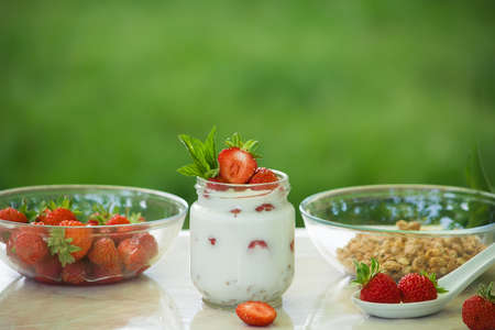 Homemade yogurt with fresh strawberry on a grey background.