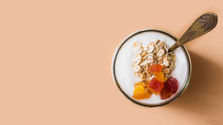 panoramic view sour cream yogurt oats fruits topping jar. High quality photo