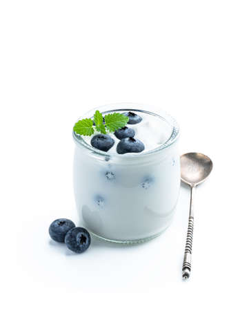 White creamy yogurt with fresh blueberry in small jar isolated on white