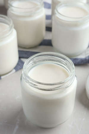 Tasty yogurt on light gray marble table