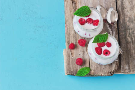 dessert of yogurt and ripe raspberries on the blue old wooden table