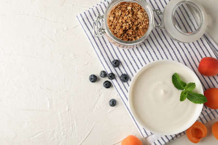 Natural white yogurt on the table. Healthy snack, Greek yogurt.