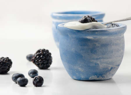 Healthy homemade yoghurt with fresh blueberries, raspberries and blackberries with early summer morning light, shallow depth of field