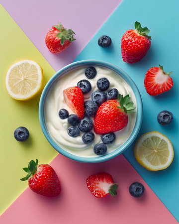 A dish of yogurt topped with fresh raspberries and blueberries, a delicious and healthy snack made with natural foods and nutrientrich berries as ingredients