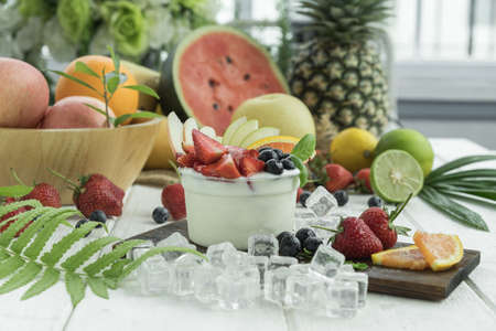 The fruits salad yogurt in glass bowl, Summer salad with ripe fresh fruits and berries on white wooden background, selective focus.
