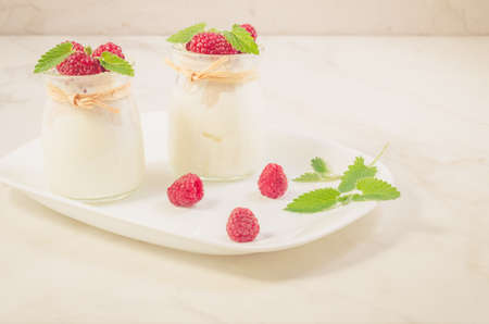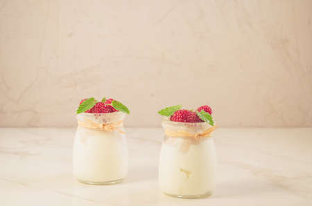two glass yogurt with raspberry and mint/two glass yogurt with raspberry and mint on a white marble table, selective focus