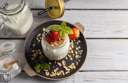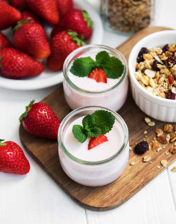 healthy breakfast, yogurt, fresh strawberries and granola on a white wooden table