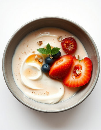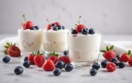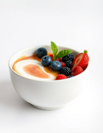 A close-up captures a glass of yogurt, artistically swirled with honey and topped with fresh blueberries, raspberries, and strawberry slices. The composition features soft lighting with a shallow depth of field, emphasizing the vibrant colors and textures of the ingredients. Ideal for culinary blogs, health and wellness publications, or any project that needs appetizing food imagery.