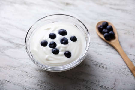 White Yogurt In Bowl With Blueberries Near Wooden Spoon Over Desk