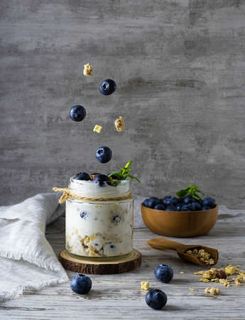 Blueberry yogurt with muesli and sour cream in a transparent barrel on a wooden stand. Blueberries with mint leaves in a wooden bowl in the background. Berries and meats hang in the air above the jar