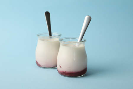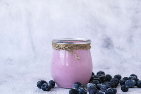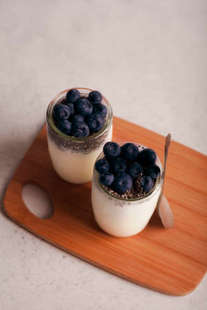 Yogurt with blueberries and Chia. Fresh healthy breakfast. Light background. White Greek yogurt in jars