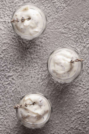 Yogurt in a glass. Lavender yogurt with Chia seeds.