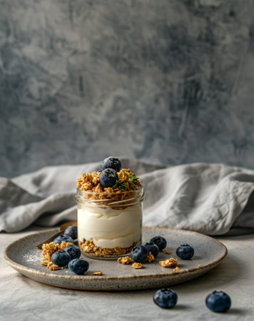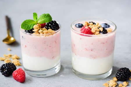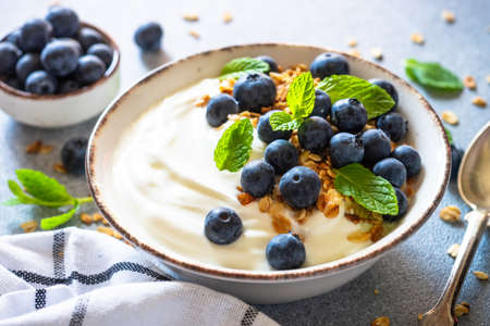 Blueberry yogurt parfait with granola, berries in glass on gray concrete background. Concept of weight loss, healthy eating, healthy dessert food