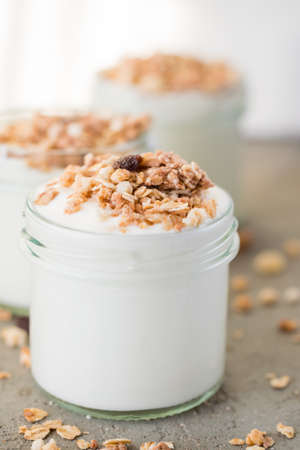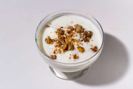 Yoghurt with granola made of oats, raisins, puffed rice, chocolate and dried bananas. Healthy breakfast for family. Healthy dairy food.