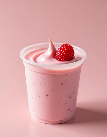 Smooth and creamy raspberry yogurt fills a clear cup, inviting taste buds to indulge. A plump raspberry rests at the peak, adding a burst of color to the soft pink background.