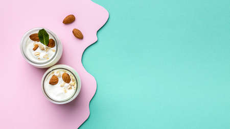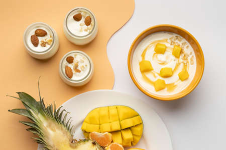 top view healthy breakfast meal with yogurt arrangement. High quality photo