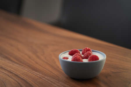 Yogurt with fresh raspberries in blue ceramic bowl on walnut table with copy space